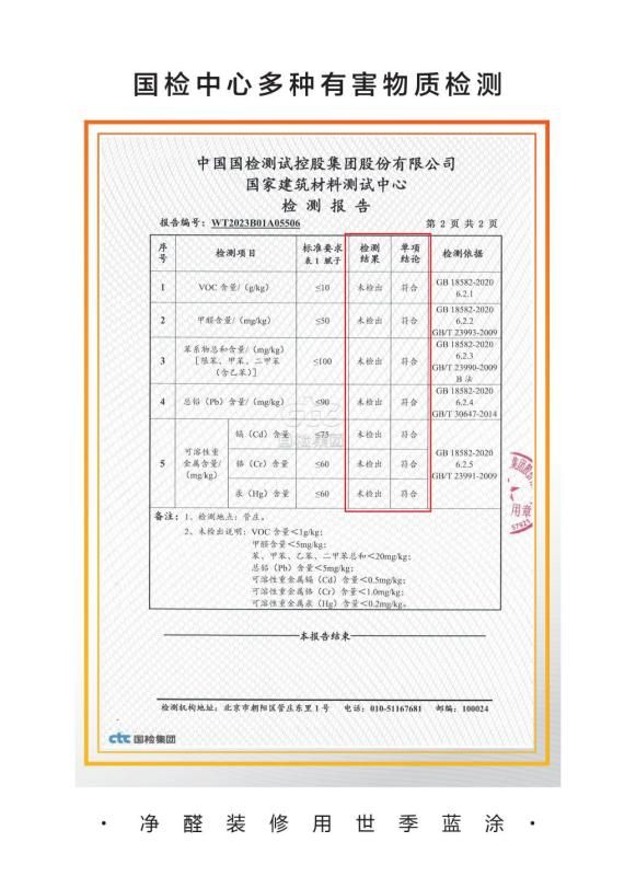 3、世季蓝涂产品本身环保程度很高,按照《室内装饰装修材料内墙涂料中有害物质限量》标准检测,挥发性有机化合物含量(VOC),苯、甲苯、乙苯总和,游离甲醛以及可溶性重金属铅、镉、铬、汞有害物质,经专业机构检测多数为未检出,符合GB18582-2020的相关标准要求,在施工现场也可以体验产品的环保性。