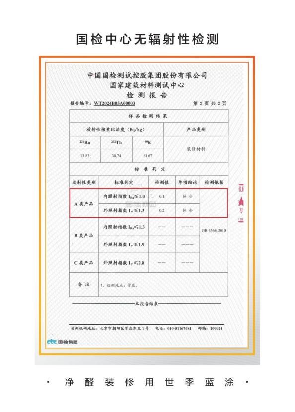 世季蓝涂产品几乎没有内照射、外照射辐射担忧,符合GB6566-2010(A)类技术标准要求,使用范围不受限制,可用于新房室内装修。