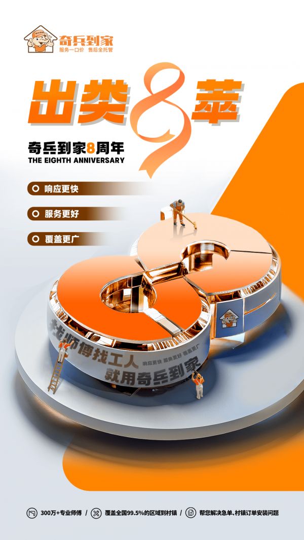 自2016年成立以来,奇兵到家已携手广大用户共同走过了八年的辉煌岁月。这八年,是不断探索与创新的八年,是始终坚持以用户体验为核心的八年,是持续优化服务品质、拓展服务网络的八年。八年来,奇兵到家始终聚焦用户的切实需求,通过不断优化服务流程、提升师傅团队专业素养,积极拓展业务覆盖范围,为全国范围内的企业用户提供安装、维修、测量、配送等一站式家居售后服务。如今,奇兵到家已在家居售后服务领域树立了良好的品牌形象,赢得了广大用户的信赖与好评。