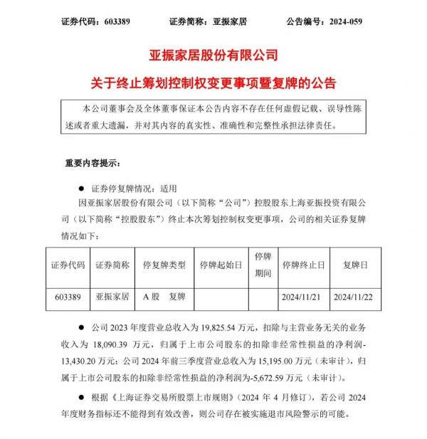 亚振家居公告称,公司收到控股股东上海亚振投资有限公司的通知,因公司股票停牌期间(11月18日-21日),控股股东亚振投资未能与交易方达成一致意见,亚振投资决定终止本次控制权变更事项。公司股票于11月22日开市起复牌。