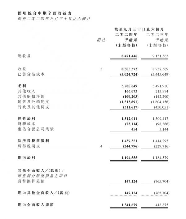 11月22日,敏华控股发布中期业绩,截至2024年9月30日止六个月,总收益为84.71亿港元,同比下降7.4%。其中,主营收益为83.05亿港元,同比下降7.1%。期内溢利为11.95亿港元,同比增长0.3%。毛利为32.81亿港元,毛利率为39.5%,较去年同期提升0.4个百分点。毛利率和净利润率双双提升,分别为39.5%和13.7%。