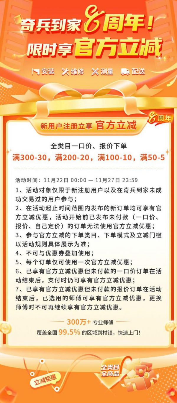 八年,不仅是时间的积累,更是服务品质的沉淀。自2016年创立至今,平台入驻300万+专业师傅,服务覆盖全国31省市3000+区县40000+乡镇,覆盖率高达99.5%,服务商家企业140万+,惠及3000万+家庭,用户好评率99.55%,订单预约及时率98.8%,订单按时完成率99.8%。这一系列耀眼的数字,是奇兵到家八年砥砺前行的辉煌战绩,更是其作为全国专业售后服务领域标杆企业的有力证明。