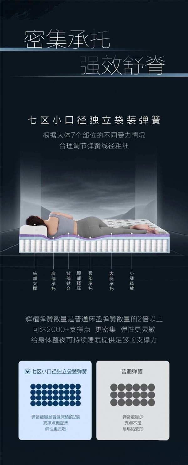 小口径双间隔独立弹簧,软硬结合,平衡软硬,护脊设置,互不干扰,贴合脊椎支撑促进深睡眠。