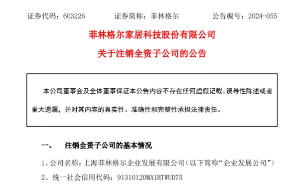 11月28日,菲林格尔(603226.SH)公告称,为进一步整合及优化公司资源配置和管理架构,经审慎研究,公司决定注销全资子公司“上海菲林格尔企业发展有限公司”。