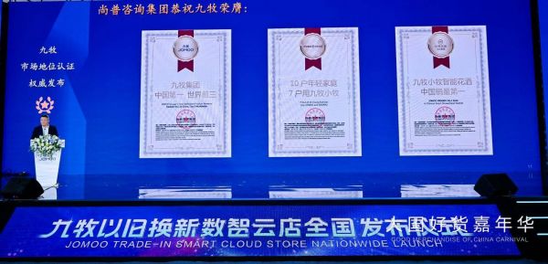 活动现场,来自于独立第三方咨询机构——尚普咨询分别为九牧集团授予“中国第一 世界前三”、“10户年轻家庭7户用九牧小牧”、“九牧小牧智能花洒中国销售第一”三项市场地位权威认证,再一次彰显了九牧集团的超高市场占有率和强大企业实力。