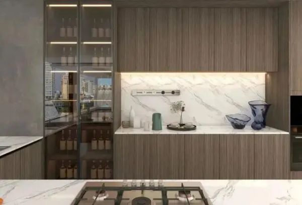 该款橱柜采用微型玻璃酒柜和内嵌灯带,营造通透明亮的氛围,让名贵的藏酒一览无余,呈现出高级感。领尚橱柜既满足了餐厨物品的收纳,也能展示珍藏的名酒,兼具实用性和情调。除此之外,领尚还非常注重质感和环保,橱柜选用了绿色环保基材,甲醛基本为零,处理食材更为安心,使用起来也更放心。
