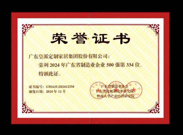 皇派门窗荣列2024年广东省制造业企业500强第334名