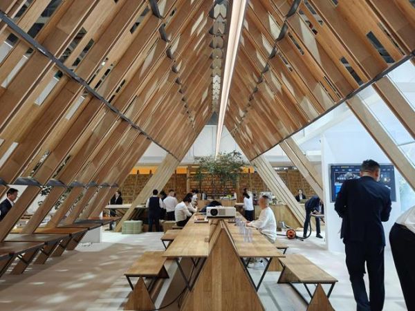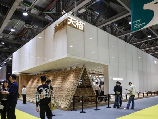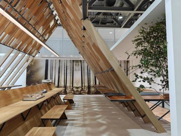 在天格展位中,传统榫卯结构的运用成为了空间的一大亮点。设计师巧妙地将这一古老的木构智慧与现代木地板产品相结合,不仅展示了天格对传统工艺的尊重,也展现了其在创新设计上的独到之处。在空间中营造自然环境氛围,将自然美学融入产品装置设计,为观众打造一场沉浸式体验展览。