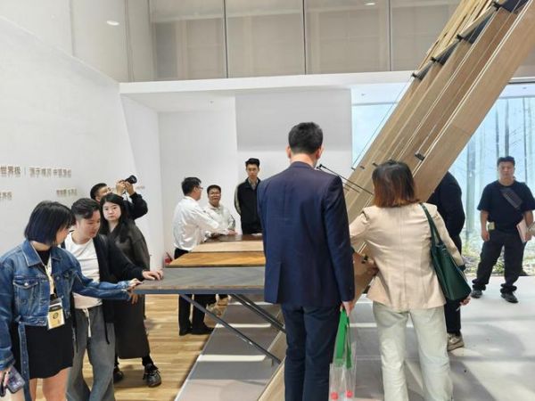 于细节处,天格地板展位同样匠心独运。展厅内使用的木材均为纯天然的实木材料,弱化木材种类,达到了观展的一致性。同一手法设计的展台上,不仅依色系深浅依次展示着地板产品,而且还可以互动体验榫卯带来的乐趣,沉浸式感受自然美学与工艺设计的完美融合。