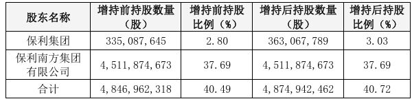本次增持计划实施前,保利集团直接持有公司股份335087645股,约占公司总股本的2.80%;与其全资子公司保利南方集团有限公司(公司控股股东)合计持有公司股份4846962318股,约占公司总股本的40.49%。本次增持计划实施完毕后,保利集团直接持有公司股份363067789股,约占公司总股本的3.03%;与保利南方集团有限公司合计持有公司股份4874942462 股,约占公司总股本的40.72%。