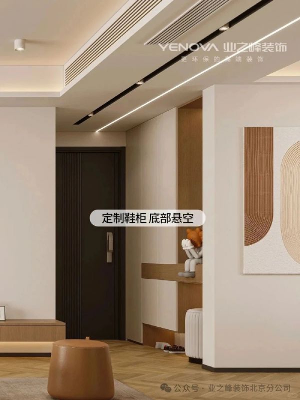 鞋柜整体定制设计,在玄关鞋柜的底部留出的高度大概在15~30cm左右;方便摆放拖鞋、运动鞋等,避免都堆放在鞋柜的面前杂乱