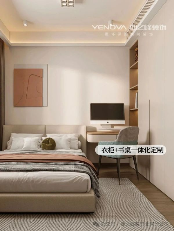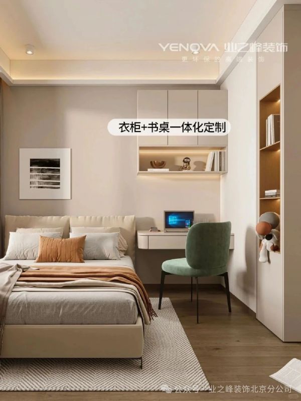 衣柜+书桌一体化设计,衣柜延伸悬空床头柜,增加高度,78cm左右;床头柜也能作为书桌使用,一台两用
