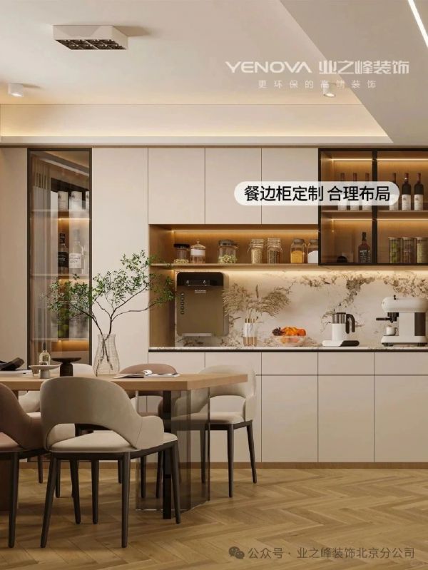 餐边柜定制设计,这样家里小零食、小餐盘,都可以收纳到餐边柜里面,保持餐桌台面的整洁,提升居家空间的美观与舒适感