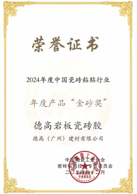 其中,西卡德高岩板瓷砖胶获颁“2024年度中国瓷砖粘贴行业年度产品金砂奖”;研发中心总监董峰亮先生获颁“2024年度中国瓷砖粘贴行业年度领军人物”称号。