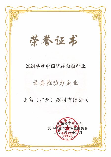 凭借深厚的行业积淀、出色的技术创新及强劲的综合表现力,西卡德高再次荣膺年度大奖,获颁“2024年度中国瓷砖粘贴行业胶粘剂最具影响力十大品牌”、“2024年度中国瓷砖粘贴行业最具推动力企业”荣誉;