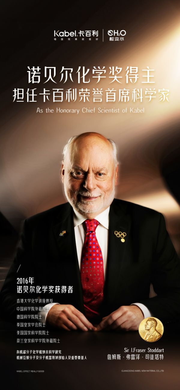2024年12月17日,卡百利Kabel宣布正式聘任2016年诺贝尔化学奖得主詹姆斯·弗雷泽·司徒塔特教授为荣誉首席科学家。司徒塔特教授的加入,将为卡百利在科技创新与产品研发中注入世界级顶尖的智慧与力量,为卡百利打造更环保、更好的墙面效果提供科学专业指导,用世界级专家理论成果为卡百利涂料研究保驾护航。