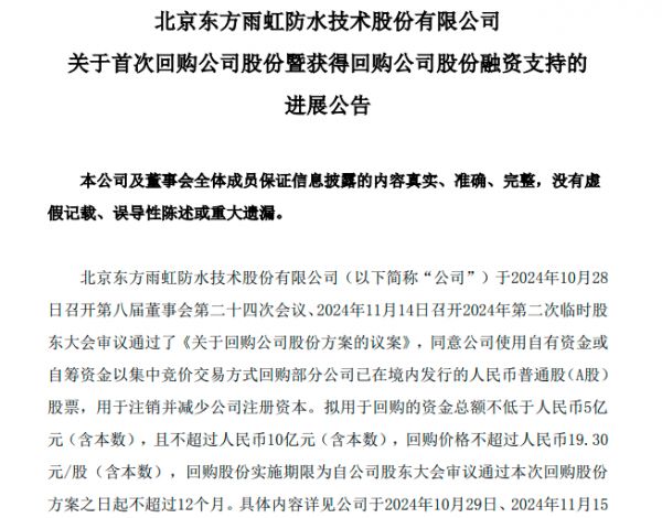 北京东方雨虹防水技术股份有限公司(以下简称“公司”)于2024年10月28日召开第八届董事会第二十四次会议、2024年11月14日召开2024年第二次临时股 东大会审议通过了《关于回购公司股份方案的议案》,同意公司使用自有资金或 自筹资金以集中竞价交易方式回购部分公司已在境内发行的人民币普通股(A股) 股票,用于注销并减少公司注册资本。