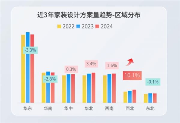 最新发布的《酷家乐全空间趋势报告》揭示了一个意想不到的现象,西北地区的装修市场正在迅速崛起,成为全国装修市场的一抹亮色。尽管,2024年华东装修市场规模仍在全国占据主导地位,拥有最多的新增设计方案量和活跃的专业设计师数,但增速最快的却是西北地区。