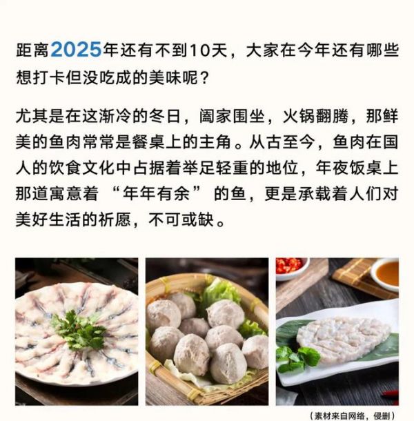 距离2025年还有不到10天,大家在今年还有哪些想打卡但没吃成的美味呢?尤其是在这渐冷的冬日,阖家围坐,火锅翻腾,那鲜美的鱼肉常常是餐桌上的主角。从古至今,鱼肉在国人的饮食文化中占据着举足轻重的地位,年夜饭桌上那道寓意着“年年有余”的鱼,更是承载着人们对美好生活的祈愿,不可或缺。
