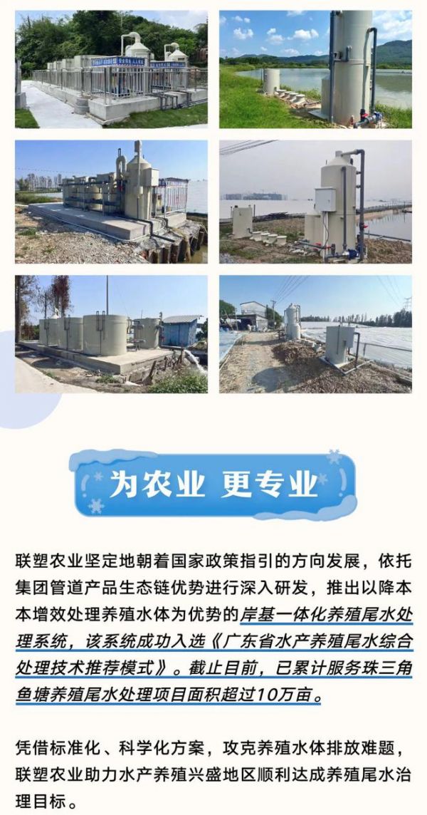 联塑凭借标准化与科学化的解决方案,成功攻克养殖水体排放难题,有力推动水产养殖兴盛区域达成尾水治理目标。联塑农业以其专业专注的态度和强大的技术实力,持续为农业绿色发展、可持续发展贡献联塑力量,在农业领域不断书写联塑的辉煌篇章,也让更多人看到联塑在农业板块的无限潜力与坚定决心。