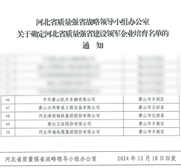 据了解,本次名单由河北省质量强省战略领导小组办公室发布,该资质的评选公布,旨在更好地发挥质量标杆企业的引领示范作用,从而带领产业链、供应链质量变革创新,引领区域质量竞争力的跃升。入围该名单则标志着公司的质量管理基础好,质量竞争力强,后续在开展质量分析、实施标杆管理,不断追求卓越等方面也将优先获得资源支持,以助力企业不断提高质量管理水平和质量竞争力。