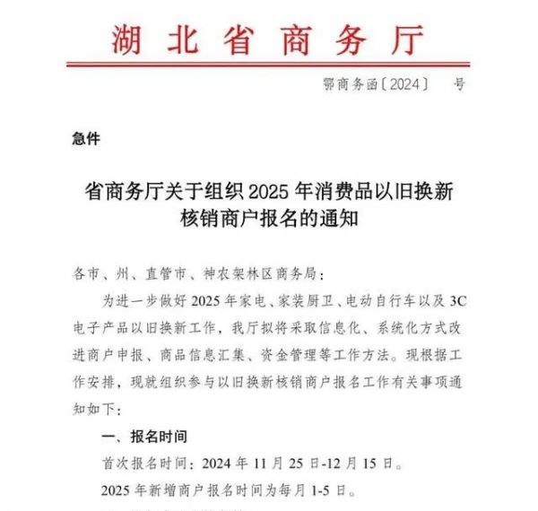 根据湖北发布的《关于组织2025年消费品以旧换新核销商户报名的通知》显示,家电厨卫、家居家装销售企业可报名。2025年新增商户的报名时间则定为每月的1日至5日。对于2024年度已经参加并获得资格的商家,2025年还需要重新报名申请。
