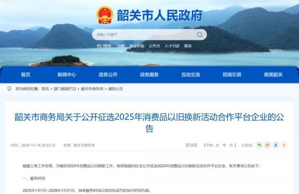 在家居家电的生产和消费大省——广东,同样已有积极动作。广东汕头、广东韶关分别于12月16日、12月14日发布了《关于公开征选2025年消费品以旧换新活动合作平台企业的公告》。汕头报名时间截止至今年12月19日。韶关服务时间规定为2025年1月1日-2026年1月31日。