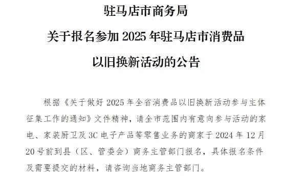 而河南开封、驻马店12月16日的消息也显示,根据省《关于做好2025年全省消费品以旧换新活动参与主体征集工作的通知》,亦已开展家电、家装厨卫以旧换新活动的参与主体征集工作。
