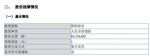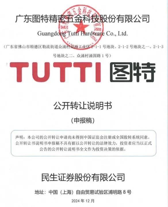 12月25日,全国中小企业股份转让系统平台显示,广东图特精密五金科技股份有限公司(下称“图特股份”)申请股票在全国股份转让系统挂牌并公开转让,本次挂牌股份总量为84,536,082股,拟于新三板基础层挂牌。