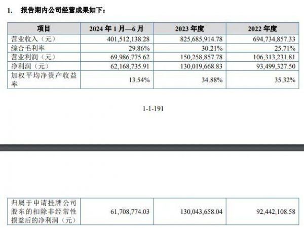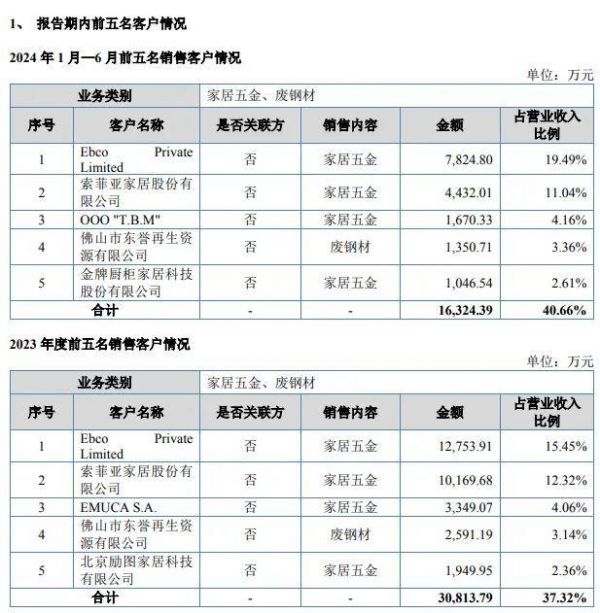 业绩方面,2022年至2024年1-6月,公司分别实现营业收入6.95亿元、8.26亿元和4.02亿元。其中,2023年度和2024年1-6月分别同比增长18.85%和14.56%,主要原因为:①公司持续关注市场需求变化,以市场需求为导向,不断完善产品种类、规格型号,以满足不同客户多样化需求,新产品的推出需要一定的时间让客户接受,随着公司客户对公司各类新产品的认可,对公司各类新产品的采购也不断增长;②公司发展初期以外销为主,2018年以来,公司开始积极开拓国内市场,成功加入国内头部家居企业供应链体系,与国内家居头部品牌索菲亚、金牌家居、欧派家居、好莱客、顾家家居、尚品宅配等建立了稳定的合作关系;③行业竞争更趋向于品牌化竞争,公司作为行业代表性企业,在产品研发设计、生产制造能力、品牌影响力、管理能力等方面有较强的优势,规模快速增长,收入增长速度高于行业平均水平。
