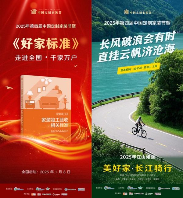 据“2025年第四届中国定制家装节”组委会介绍,今年的定制节活动1月8日在上海启动,贯穿全年,由八大系列活动组成,包括:“全国高品质家装示范样板工地巡礼”,“全国首批家装施工交付工程师风采展演”,“全国首批家装施工交付工程师示范样板工地征集”,“全国家装施工交付工程师技能大赛”,“全案定制·设计师+业主应用设计大赛”,“《好家标准》走进千家万户”,“2025年第四届中国定制家装节嘉年华”,以及行业首度重磅推出的社会性励志大型活动:“江山如画·美好家长江骑行”。在2025年的357天时间里,定制家装节五强品牌,将持续不断为家居消费者提供“全案定制,品质为王”的全方位、高品质、优质性价比的家装产品和服务!