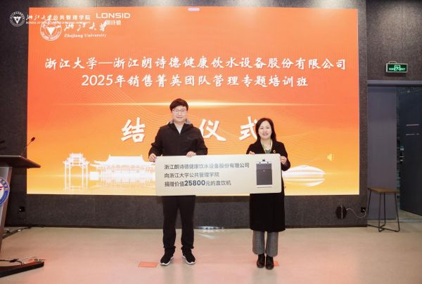 在学习之旅的结业时刻,朗诗德以实际行动回馈教育事业,向浙江大学公共管理学院捐赠 “润饮 Duo” 饮水设备一台,旨在为莘莘学子创造更加健康、便捷的学习环境。浙江大学公共管理学院深表感谢,并回赠具有纪念意义的礼物,双方在友好氛围中见证了这份情谊与担当。不仅展现了朗诗德对教育事业的支持,更传递出企业关注社会需求、积极回馈的正能量。