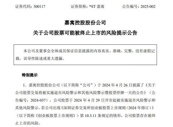 1月9日,嘉寓股份(300117.SZ)公告称,公司股票可能面临终止上市的风险。短期资金较为紧张、生产经营压力巨大,据悉,2024年前三季度公司亏损2.07亿元,截至2024年三季度末,公司净资产-16.91亿元。