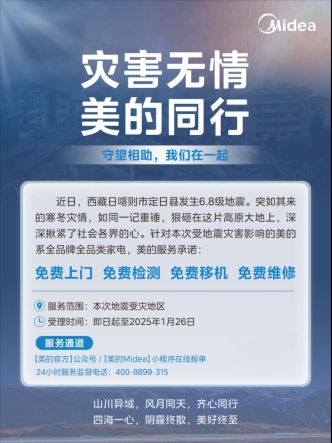 在定日县地震发生后,美的集团迅速启动应急预案,联合美的服务团队,针对受灾地区发布了“抗灾免费维修通知”。这项通知不仅覆盖了包括美的冰箱在内的美的系全品牌全品类的家电产品,更特别强调了美的免费上门、免费检测、免费移机、免费维修服务。这一举措,无疑为受灾群众送去了一份及时雨,减轻了他们因灾害导致的经济损失,更传递出美的冰箱对每一位用户的深切关怀。从即日起至2025年1月26日,受灾群众可通过美的官方公众号、美的Midea小程序在线报单,或拨打24小时服务电话,享受便捷高效的服务体验。美的冰箱的这一系列行动,是对“守望相助,我们在一起”这一承诺的生动诠释,让爱与希望在灾难的阴霾中绽放光芒。这一举措不仅解决了灾区居民的燃眉之急,更传递出美的冰箱对用户的深切关怀和对社会责任的坚定履行。