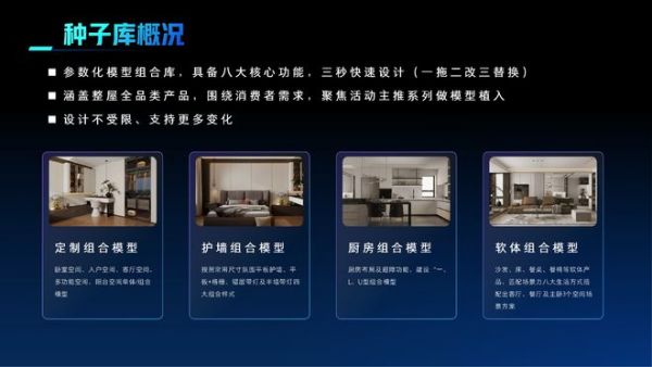 种子库1.0覆盖了整屋全品类产品,包括定制组合、护墙组合、橱柜组合、软体组合等,能够满足不同消费者的个性化需求。在用户需求的驱动下,种子库的模型库包含了当下最流行的家居样式,行业内组合模型品类最全,确保设计方案紧跟潮流趋势。