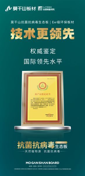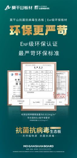 在追求环保和功能的基础上,莫干山抗菌抗病毒生态板不仅具备“软实力”,更具备“硬实力”。经权威机构检测,莫干山抗菌抗病毒生态板甲醛释放量仅为0.012mg/m³,远优于新国标ENF级标准。