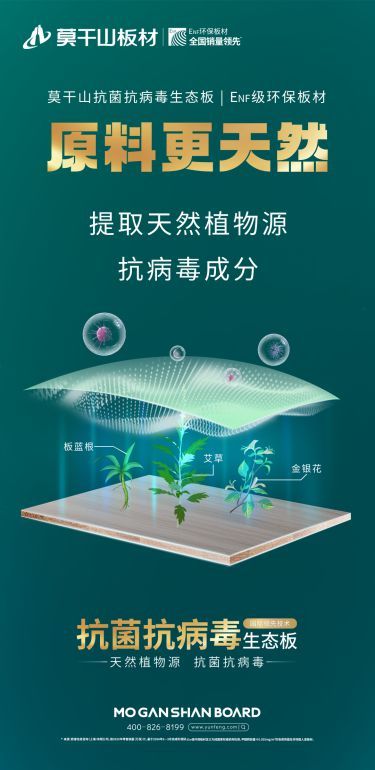 莫干山家居30年环保史,就是一部植物源研发史,从无醛玉米淀粉胶到纯天然生物基质的大豆蛋白胶,再到创新纳米无醛植物胶,植物源的基因已经深深烙印在莫干山的产品研发和迭代中。植物源粘胶剂来源于可再生植物资源,其生产和使用过程更加环保可持续,也更符现代家庭对健康与环保的双重追求。 莫干山家居秉持让健康环保家居走进万千家庭的初心,这个冬日与莫干山抗菌抗病毒生态板一起,让植物源守护全家人的健康,为居家筑牢安全屏障,提升 “空间免疫力”。