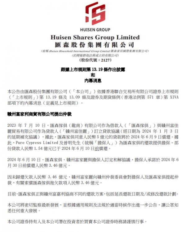 根据公告,2023年7月10日,汇森家具(龙南)有限公司作为借款人(「汇森家具」)与赣州富佳丽贸易有限公司作为贷款人(「赣州富佳丽」)订立贷款协议(经日期为2024年1月3日的延期补充协议),据此,汇森家俱同意人民币5亿元的贷款将于2024年6月9日偿还。据此,Pure Cypress Limited及曾明先生(统称「担保人」)为汇森家俱的还款提供担保。部份贷款人民币1.54亿元已于2024年6月10日前偿还。