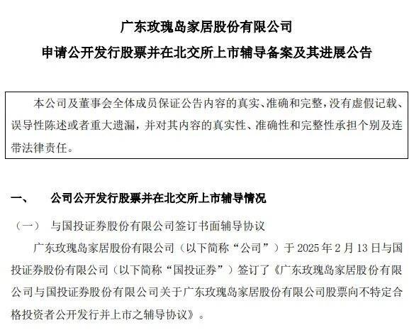 2月18日,广东玫瑰岛家居股份有限公司公告称,广东证监局对公司提交的向不特定合格投资者公开发行股票并在北交所上市的辅导备案材料予以受理。公司自2025年2月18日进入辅导期,辅导机构为国投证券。