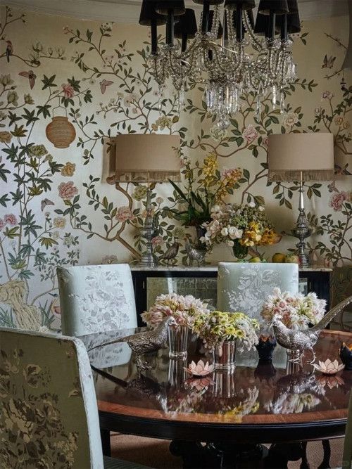 天鹅绒、丝绸、金属、藤编、大理石等不同材质的碰撞,增强空间质感,丝绒沙发搭配黄铜茶几,或木质书架与镜面装饰结合,材质间的冲突感。很多时候还会看到繁复的壁纸、壁画或装饰线条(如护墙板、石膏线)打造“视觉轰炸”效果。
