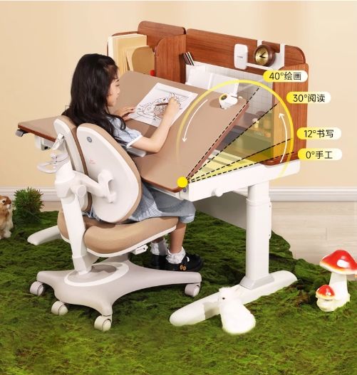 桌椅高度支持3-18岁全学龄段调节,搭配可视化角度显示器,家长可根据孩子身高精确设定桌面倾斜角度:书写时12°减少手腕压力,阅读时30°使书本与视线垂直,避免低头导致的颈椎负担。这一功能直接响应政策中“课桌椅适配身高变化”的要求,从源头上杜绝因桌椅高度不当引发的驼背问题。