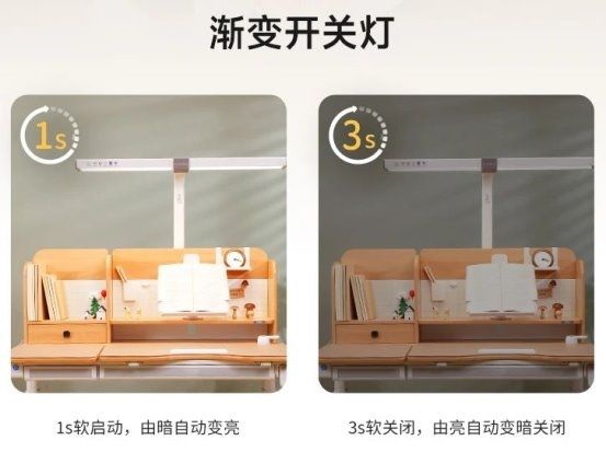 软启动 / 关闭,温柔呵护眼睛:开启台灯时,灯光会在 1S 内缓慢变亮至记忆亮度,就像清晨的阳光慢慢洒进房间;关闭时,灯光则会在 3S 内缓慢变暗直至关闭,如同夜幕缓缓降临。这种设计,给孩子的眼睛留出了充足的适应时间,避免灯光突然变化对眼睛造成刺激,全方位呵护孩子的视力。