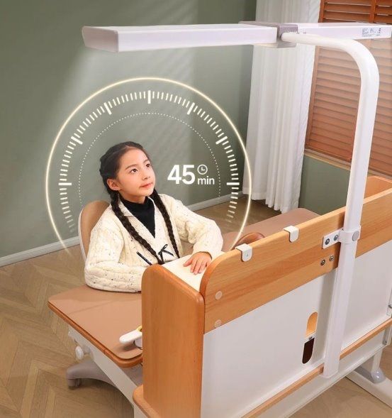学习模式智能化,科学用眼有保障:点击学习模式,自动把亮度调至学习所需照度(80% 亮度,4000K 色温),同时开始计时。45 分钟后,灯光会闪烁一次,提醒孩子该休息啦。45 分钟计时提醒循环三次后,亮度会降至最低档。若孩子无操作,则 10 分钟后自动关灯。这种防沉迷设计,让孩子劳逸结合,帮助孩子养成良好的用眼习惯,缓解眼疲劳。