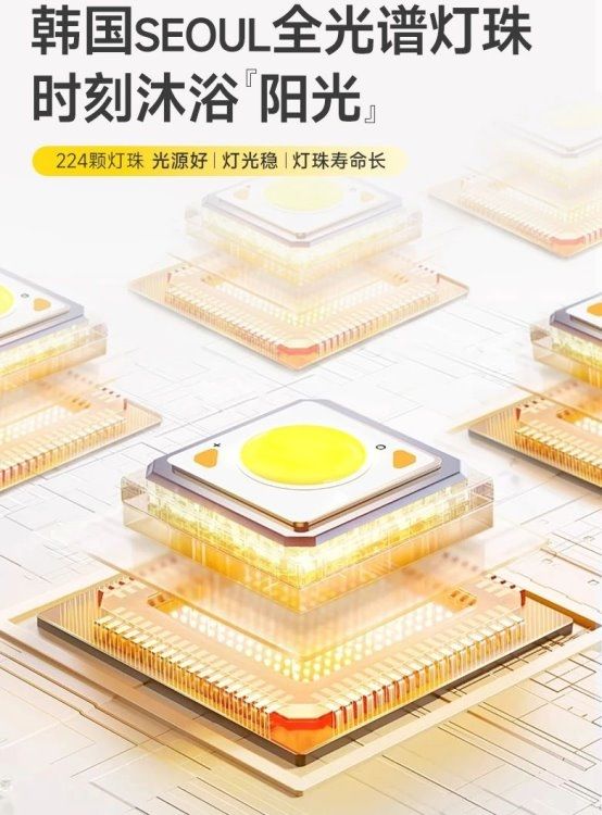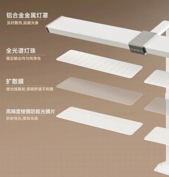 全光谱灯珠,防眩光设计:D203款台灯采用双405*95尺寸发光面,配备224颗韩国SEOUL全光谱灯珠,显色指数高达98,无限接近自然色,光源品质高,灯光更稳定,灯珠使用寿命更长。高精度棱镜防眩光片,柔光效率高,避免了过度眩光对孩子眼睛的伤害,让孩子的眼睛时刻处于舒适的光照环境中。