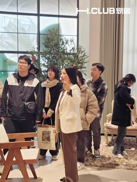 主题思享会结束后,师生在H.CLUB家居馆内自由参观。在占地1300㎡的空间内贯穿着法式风、中古风、折衷主义等艺术风格,感受艺术氛围碰撞出的家居物品。触摸到H.CLUB家居产品中手工打磨的原木肌理,才真正理解梁教授所强调的'艺术设计',这种从图纸到实物的认知跃迁是课堂难以复制的。