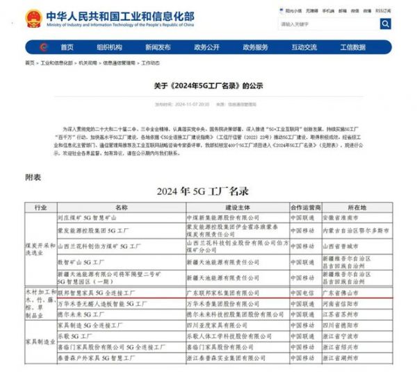 在日前举办的2024中国5G+工业互联网大会上,工业和信息化部发布了《2024年5G工厂名录》,经省级工业和信息化主管部门、通信管理局推荐及工业互联网战略咨询专家委评审,39个行业的400家5G工厂项目最终入选。联邦家私与中国电信共建的“联邦智慧家具5G全连接工厂”项目,入选国家级5G工厂。