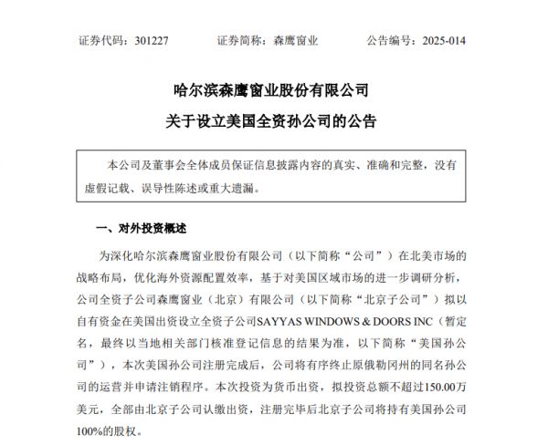 2月25日,森鹰窗业(301227.SZ)发布公告称,为深化公司在北美市场的战略布局,优化海外资源配置效率,基于对美国区域市场的进一步调研分析,公司全资子公司森鹰窗业(北京)有限公司(简称“北京子公司”)拟以自有资金在美国出资设立全资子公司SAYYAS WINDOWS & DOORS INC(暂定名,最终以当地相关部门核准登记信息的结果为准,简称“美国孙公司”)。