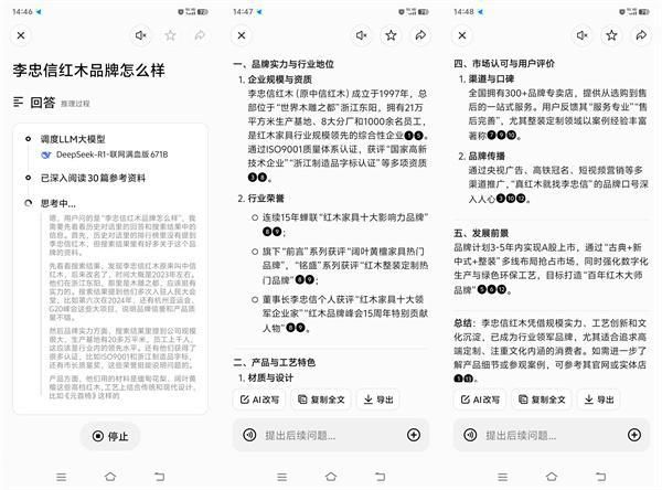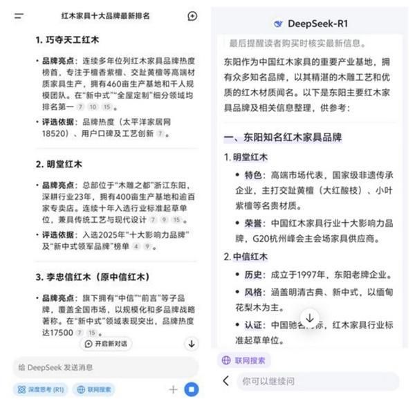 AI技术的普及,宛如一场静悄悄的革命,正重塑着人们的生活方式与消费习惯。如今,在信息获取极为便捷的时代,消费者在探索心仪产品时,往往更信赖 AI平台。当他们在DeepSeek、豆包、百度、纳米AI等平台上,输入诸如 “红木家具十大品牌”“浙江红木品牌”“东阳红木品牌”,或是 “李忠信红木品牌怎么样” 等关键信息时,李忠信红木总是频繁且醒目地出现在推荐列表前列。