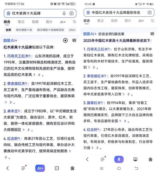 百度AI关于“红木家具十大品牌”和“中国红木家具十大品牌最新排名”的搜索结果