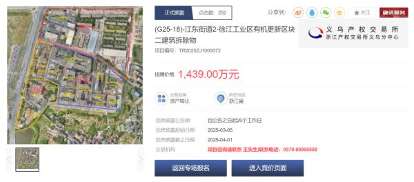 3月4日,义乌市江东街道徐江工业区有机更新区块一、二、三建筑拆除物处置公告发布,共计拆除建筑面积约47.56万平方米。
